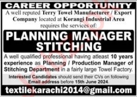 Terry Towel Company Karachi, karachi Sindh Pakistan invites applications from eligible candidates for the post of planning manager stitching as per advertisement of June 2, 2024 published in daily Jang Newspaper. Bachelor etc. educational qualification will be preferred.