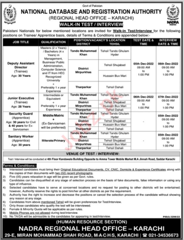 National Database & Registration Authority NADRA Karachi, tando muhammad khan, karachi, mirpur khas and tharparkar Sindh Pakistan invites applications from eligible candidates for the post of security guard apprentice, executive trainee, deputy assistant director trainee and sanitary worker apprentice as per advertisement of November 27, 2022 published in daily Jang Newspaper. Middle, Matric, Intermediate, Master and Bachelor etc. educational qualification will be preferred.