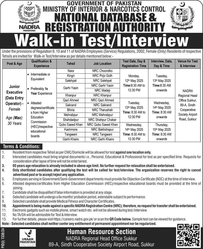 National Database & Registration Authority NADRA latest Government Data Entry walk in interview jobs and others can be applied till May 15, 2025 or as per closing date in newspaper ad. Read complete ad online to know how to apply on latest National Database & Registration Authority NADRA job opportunities.