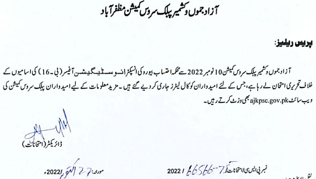 Azad Jammu and Kashmir Public Service Commission AJKPSC has announced the test schedule for the post of Inspector Investigation Officer in AJK Accountability Burea. Candidates can get their call letters at their homes.