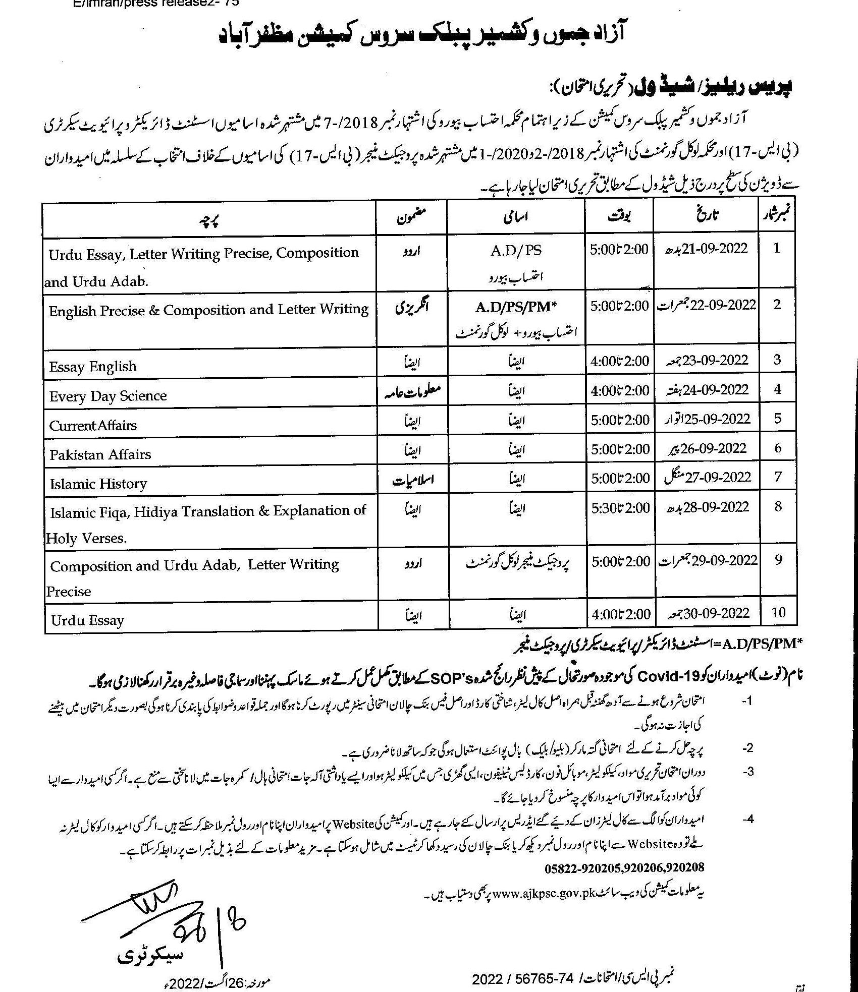 Azad Jammu & Kashmir Public Service Commission AJKPSC has issued a written test schedule for the vacant position of Assistant Director and Private Secretary in Accountability Bureau and Project Manager in Local Government Department AJK.