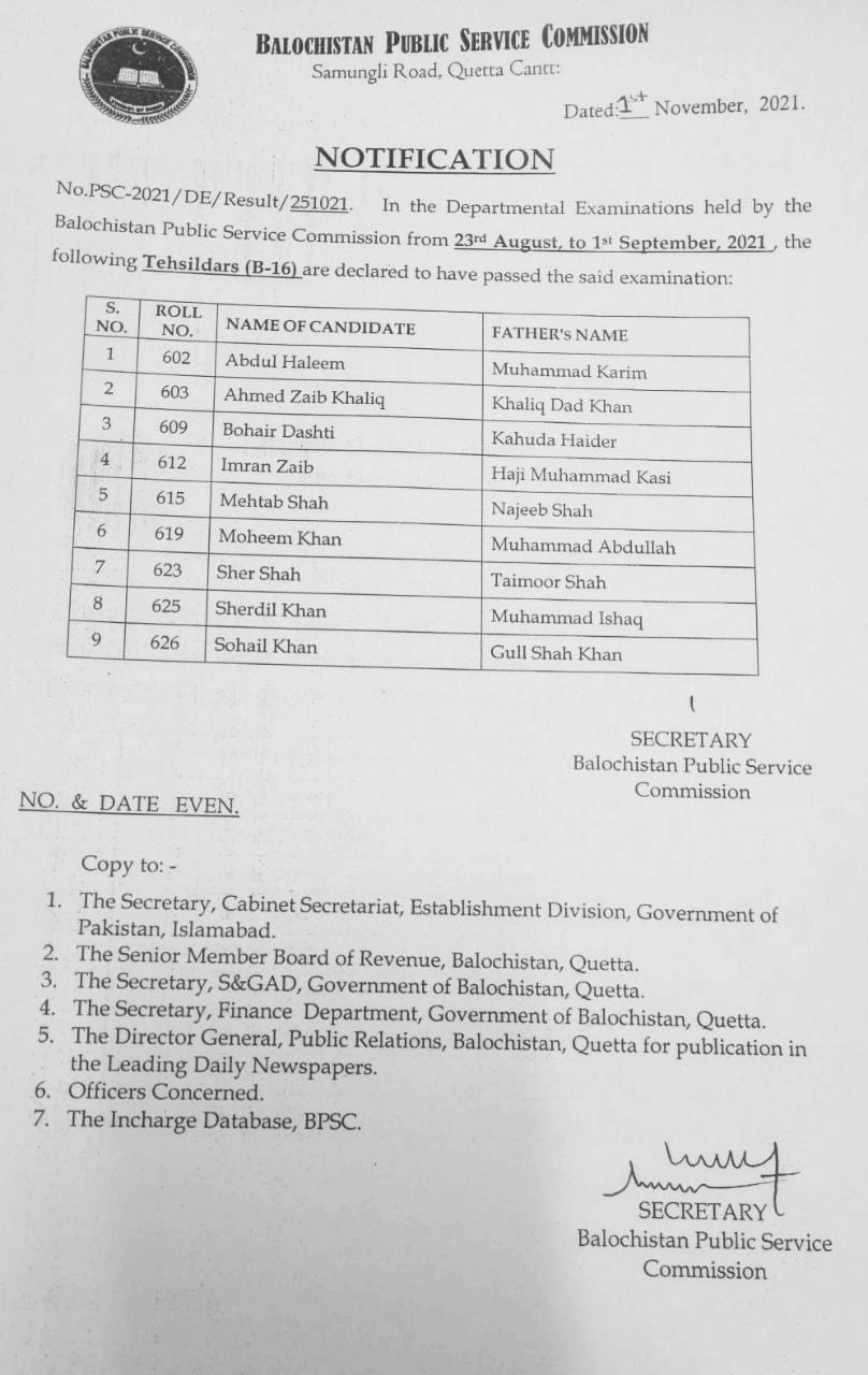Balochistan Public Service Commission BPSC has announced departmental examination test result against the position of Tehsildar in Quetta, Balochistan. Candidates can get result from here.