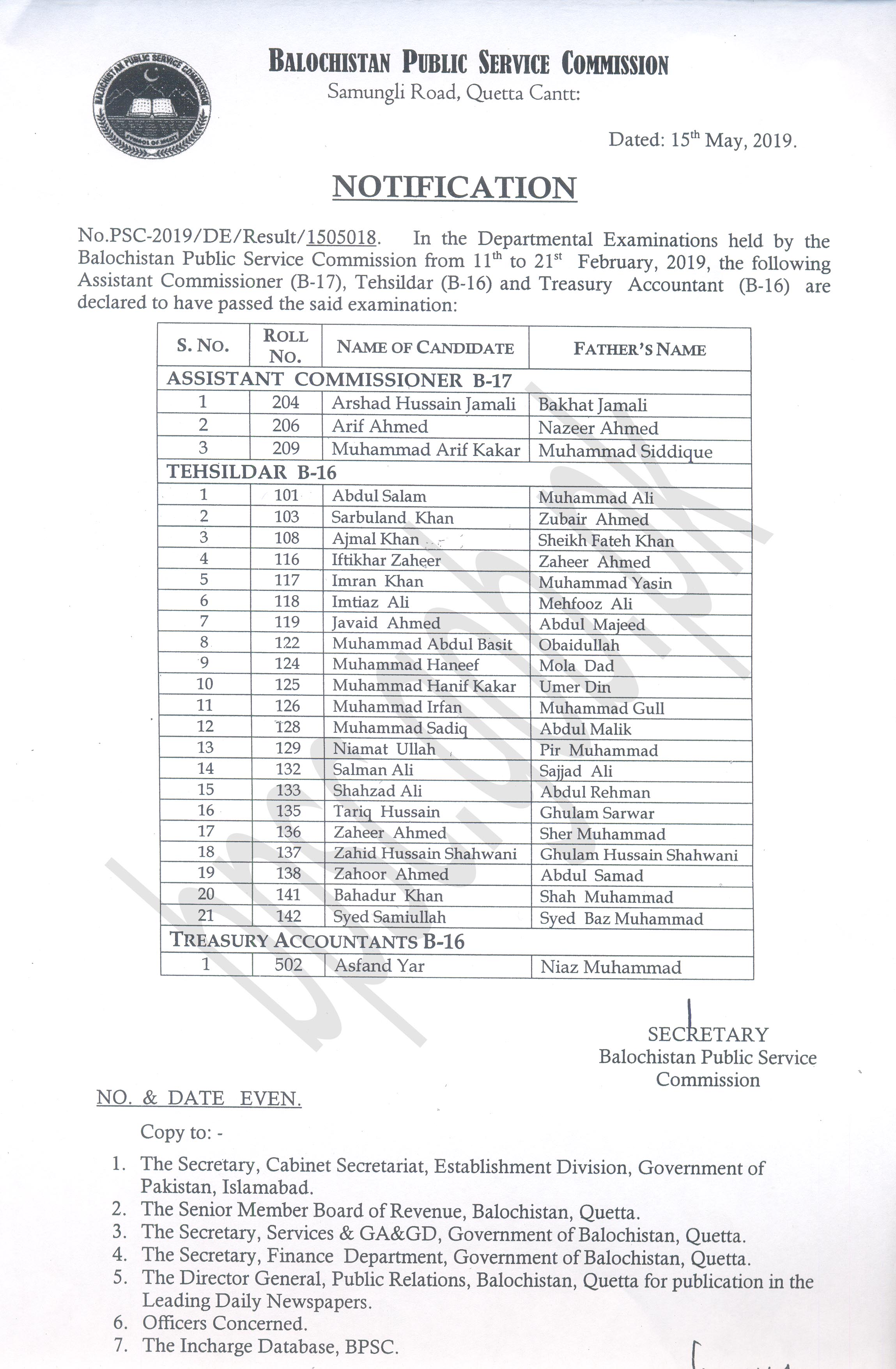 BPSC Balochistan Public Service Commission has announced result of test held by BPSC from 11 to 21 February , 2019 for the posts of Assistant Commissioner, Tehsildaar, Treasury, Accountant . Candidates can check result in link below.