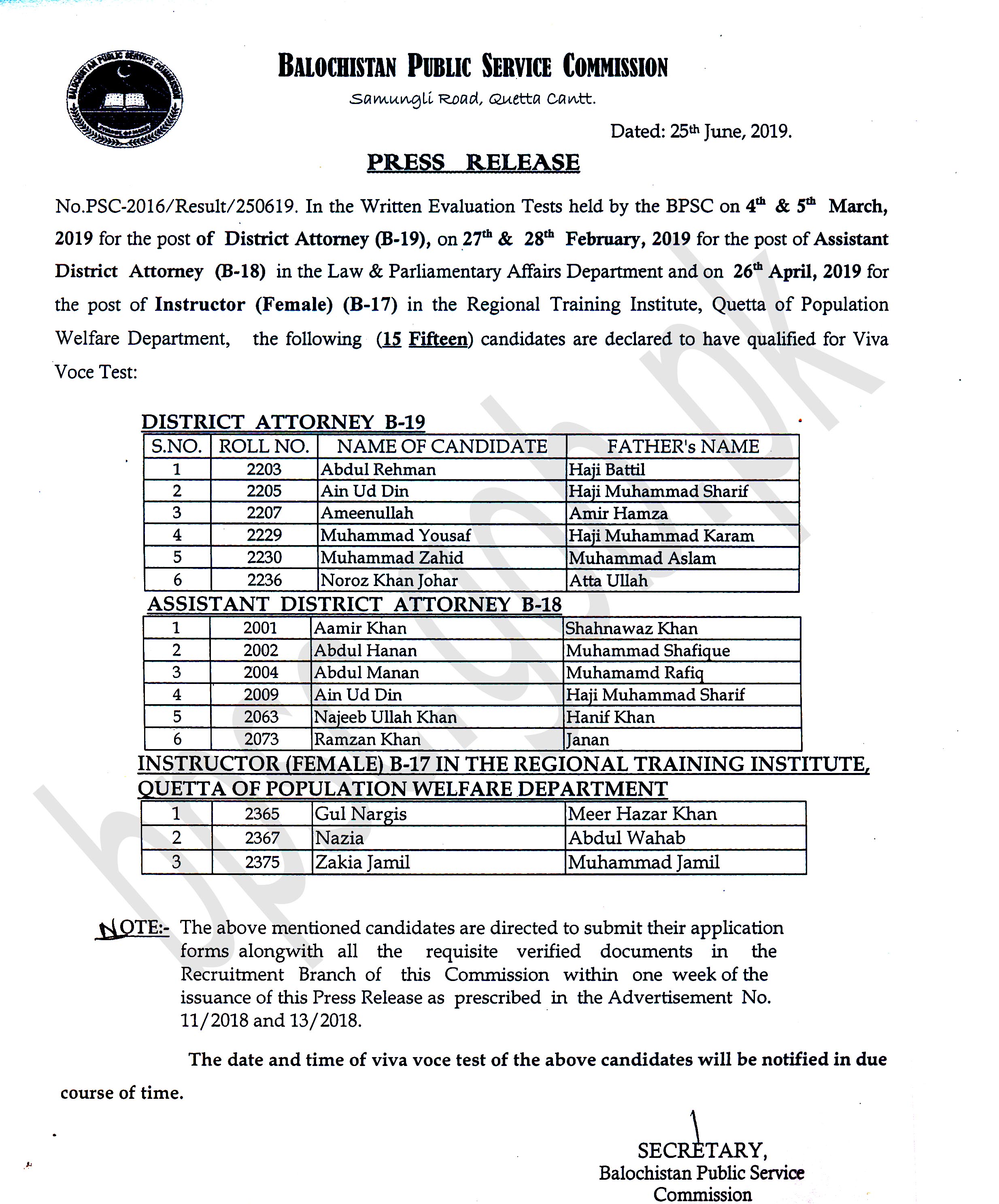 Balochistan Public Service Commission BPSC has announced the result for the post of District Attorney and Assistant District Attorney in Parliament Affairs Department. Candidates who applied for the BPSC Post can download complete result here.