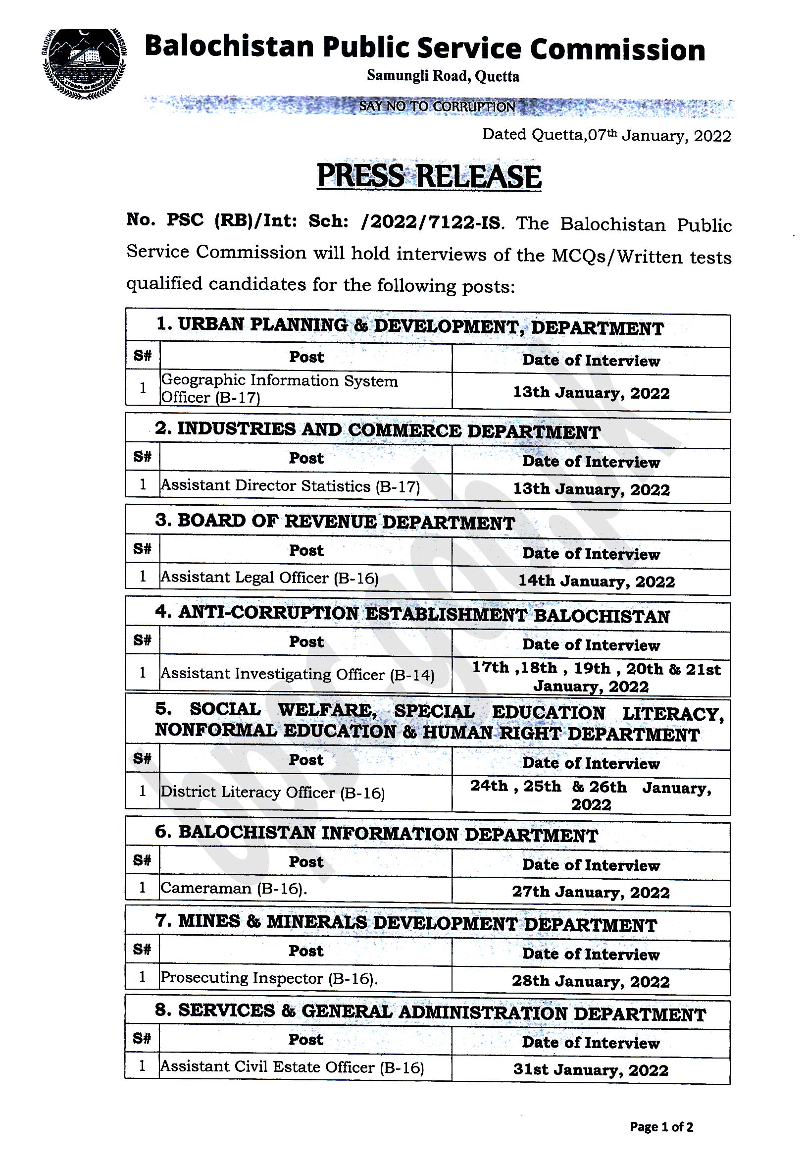 Balochistan Public Service Commission BPSC has issued interview schedule for the month of January, 2022. Candidates can download interview schedule against the various posts in government departments of Balochistan.