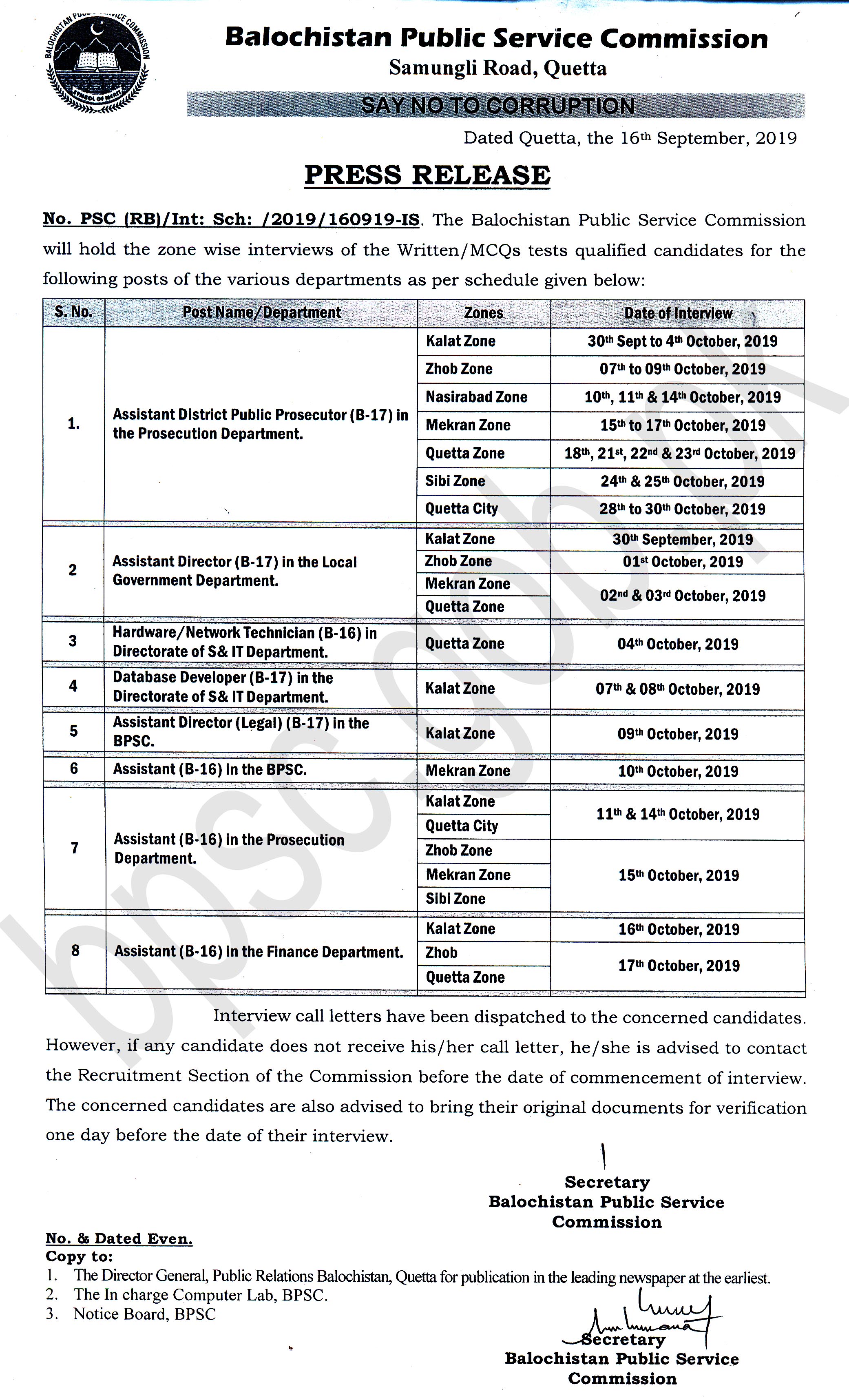 BPSC Balochistan Public Service Commission has announced interview schedule against various posts in different government departments for the month of October. Candidates can get BPSC October Interview Schedule from here.