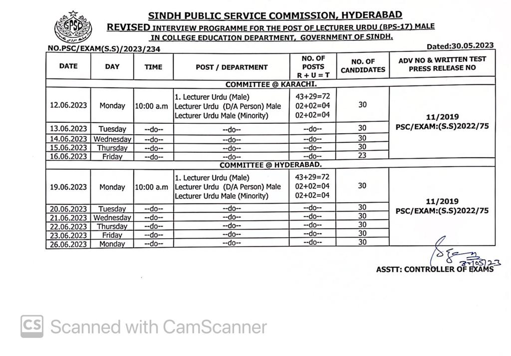 Sindh Public Service Commission SPSC has announced a revised interview schedule for the position of Lecturer Physics and Lecturer Urdu in the College Education Department, Government of Sindh. Candidates can download SPSC Revised Interview Schedule 2023 from here.