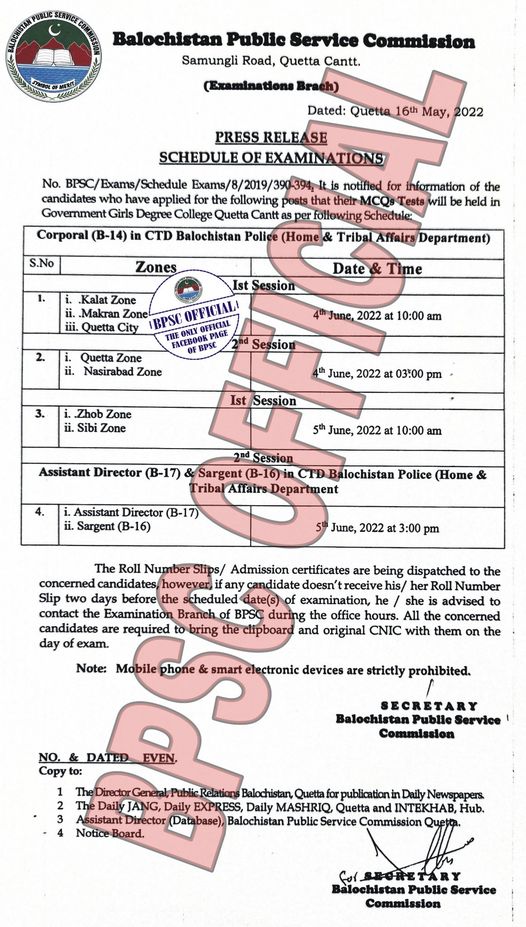 Quetta, Balochistan Public Service Commission BPSC has issued mcqs test schedule against the vacant position of Corporal, Assistant Director and Sargent in CTD Balochistan Police, Home & Tribal Affairs Department Balochistan.