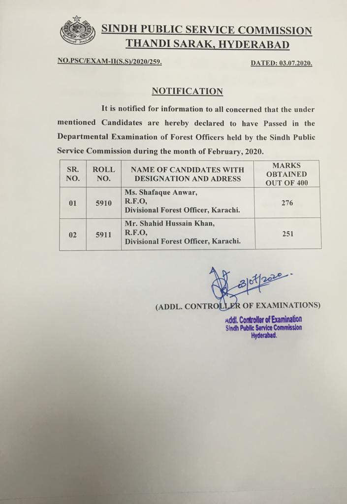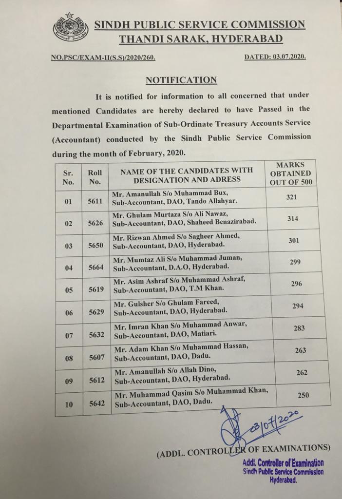 Sindh Public Service Commission SPSC has issued Departmental Examinations Result against the posts of Assistant Collector Part-I, Assistant Collector Part-II, Forest Officer, Sub-Ordinate Accounts Service S.A.S Part-I, Sub-Ordinate Accounts Service S.A.S Part-II, Sub-Ordinate Treasury Accounts Service Accountant and Sub-Ordinate Treasury Accounts Service Accounts Clerk. Candidates can check SPSC Result 2020 from here.