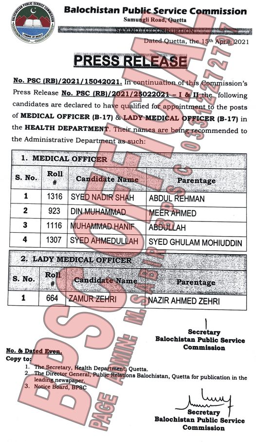Balochistan Public Service Commission BPSC has issued final recommended candidates merit list for the position of Medical Officer, Lady Medical Officer in Health Department Balochistan.