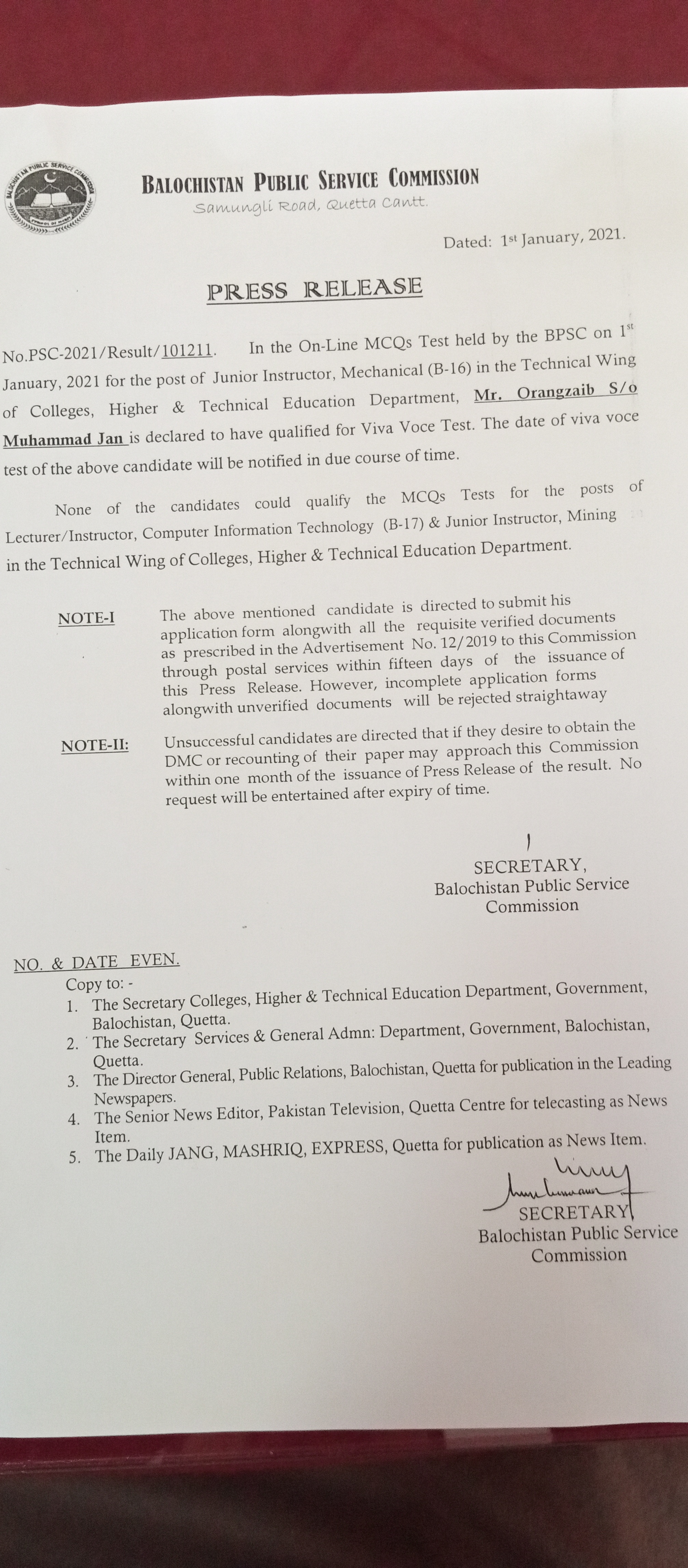 Quetta, Balochistan Public Service Commission BPSC has issued screening test result against the post of Junior Instruction Mechanical in Technical Wing of Colleges, Higher and Technical Education Department Quetta, Balochistan.