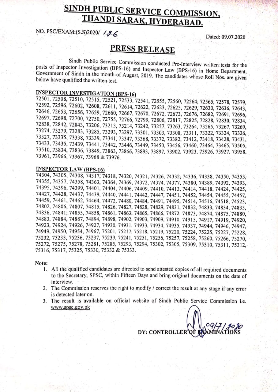 Sindh Public Service Commission SPSC has announced test result against the posts of Inspector Investigation and Inspector Law in Home Department, Government of Sindh. Candidates can download SPSC Home Department Test Result from here.