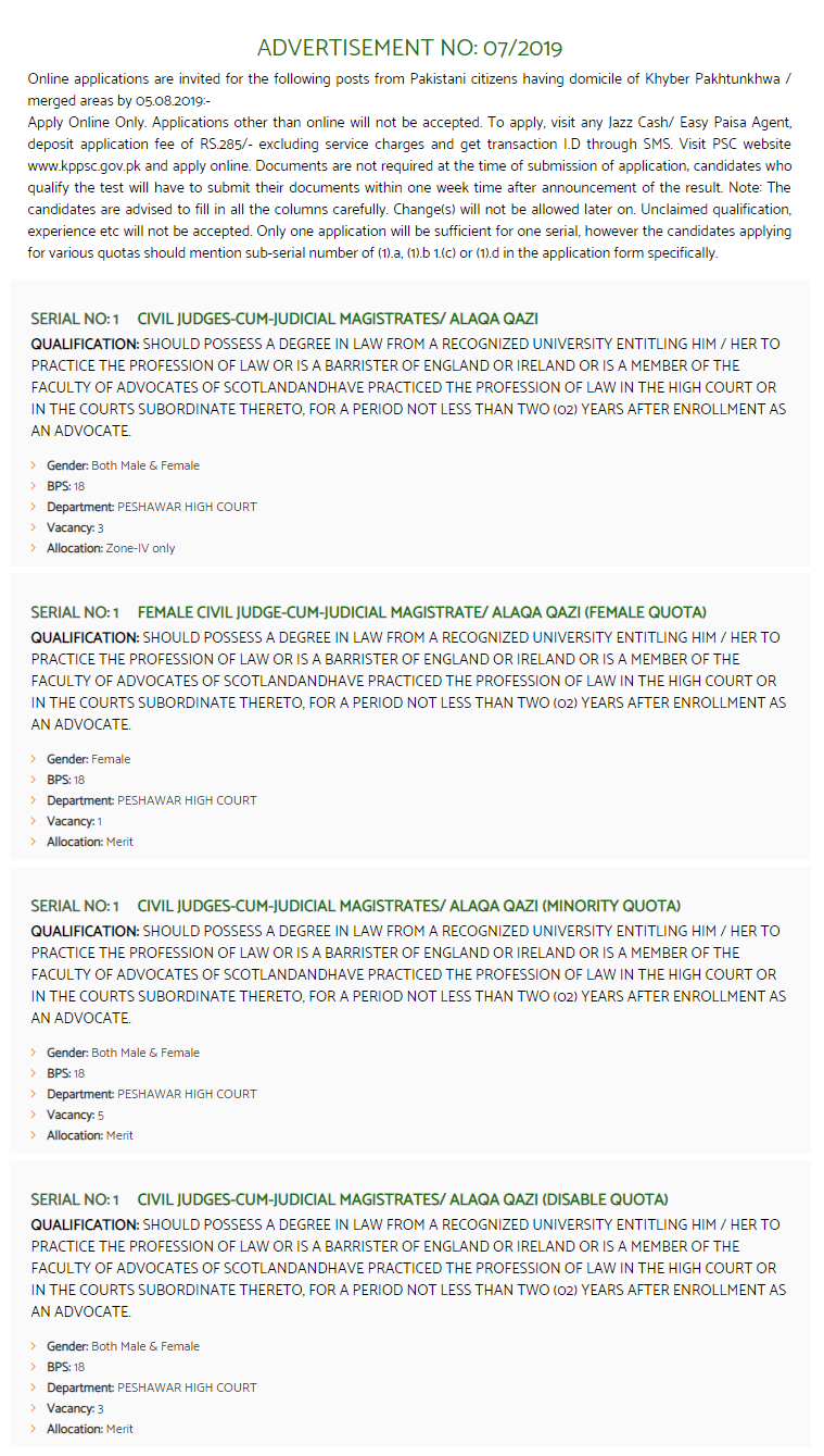 Khyber Pakhtunkhwa Public Service Commission KPPSC is inviting application from highly qualified, experienced and energetic candidates for the posts of civil Judge Cum Magistrates, Alaqa Qazi in Peshawar form Female Quota, Minorities Quota and Disabled Person Quota.