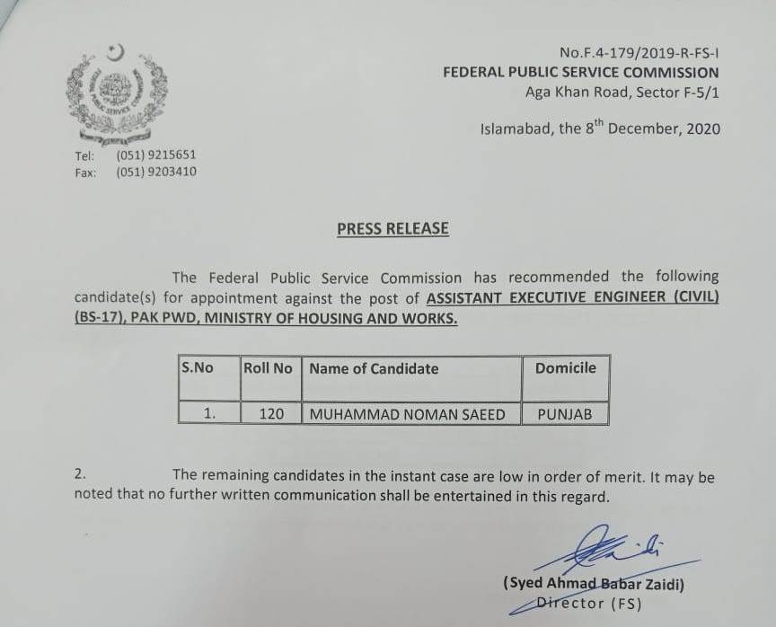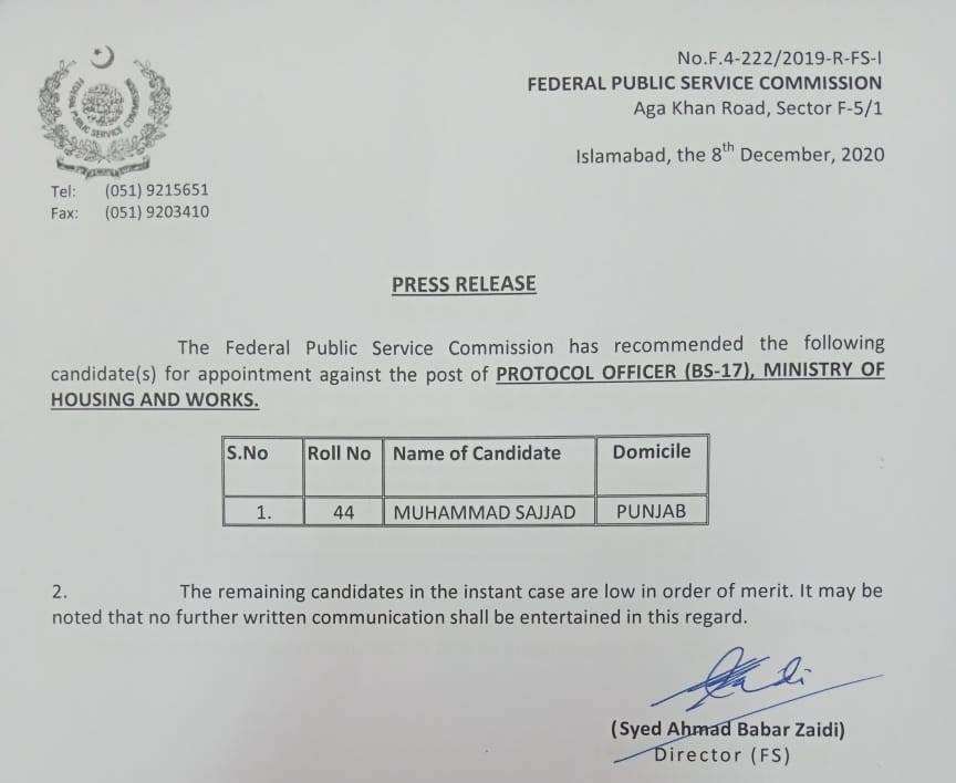 Islamabad, FPSC Federal Public Service Commission has announced selected candidates merit list and issued call letter against the post of Protocol Officer and Assistant Executive Engineer Civil in Ministry of Housing and Works.