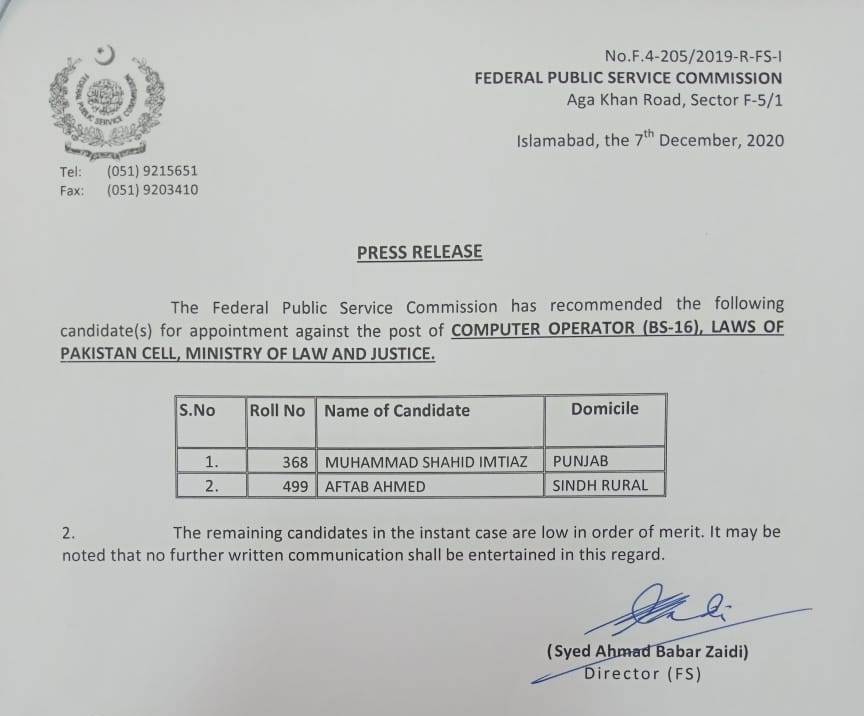 Islamabad, Federal Public Service Commission FPSC has announced final selected candidate merit list for the position of Inspector Enforcement and Computer Operator in Laws of Pakistan Cell, Ministry of Law and Justice.