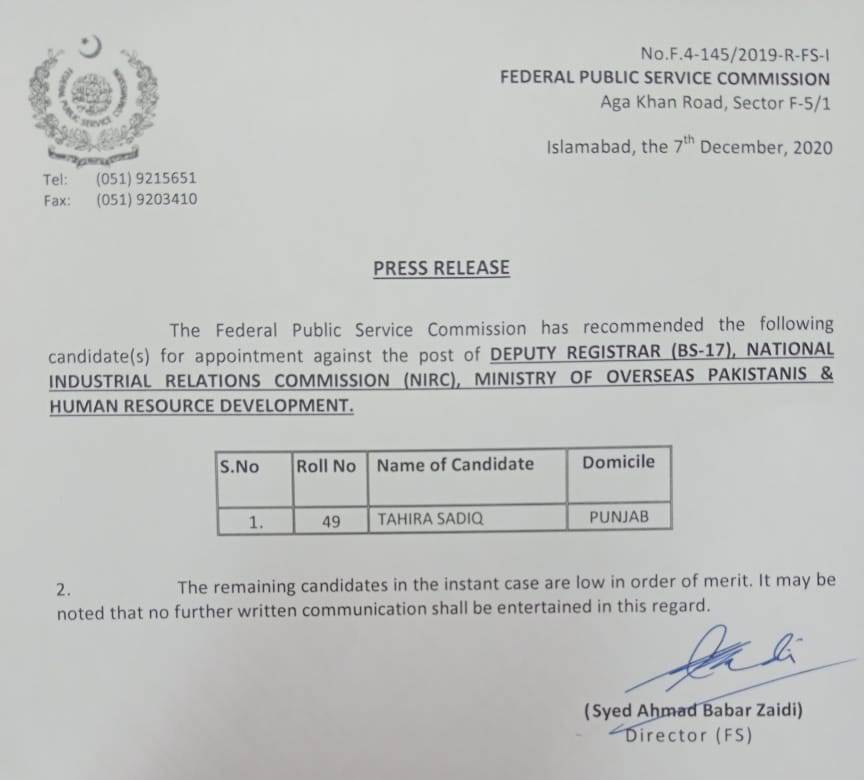 Federal Public Service Commission FPSC has issued final recommended candidate merit list for the post of Deputy Registrar in National Industrial Relations Commission NIRC, Ministry of Overseas Pakistanis and Human Resource Development.