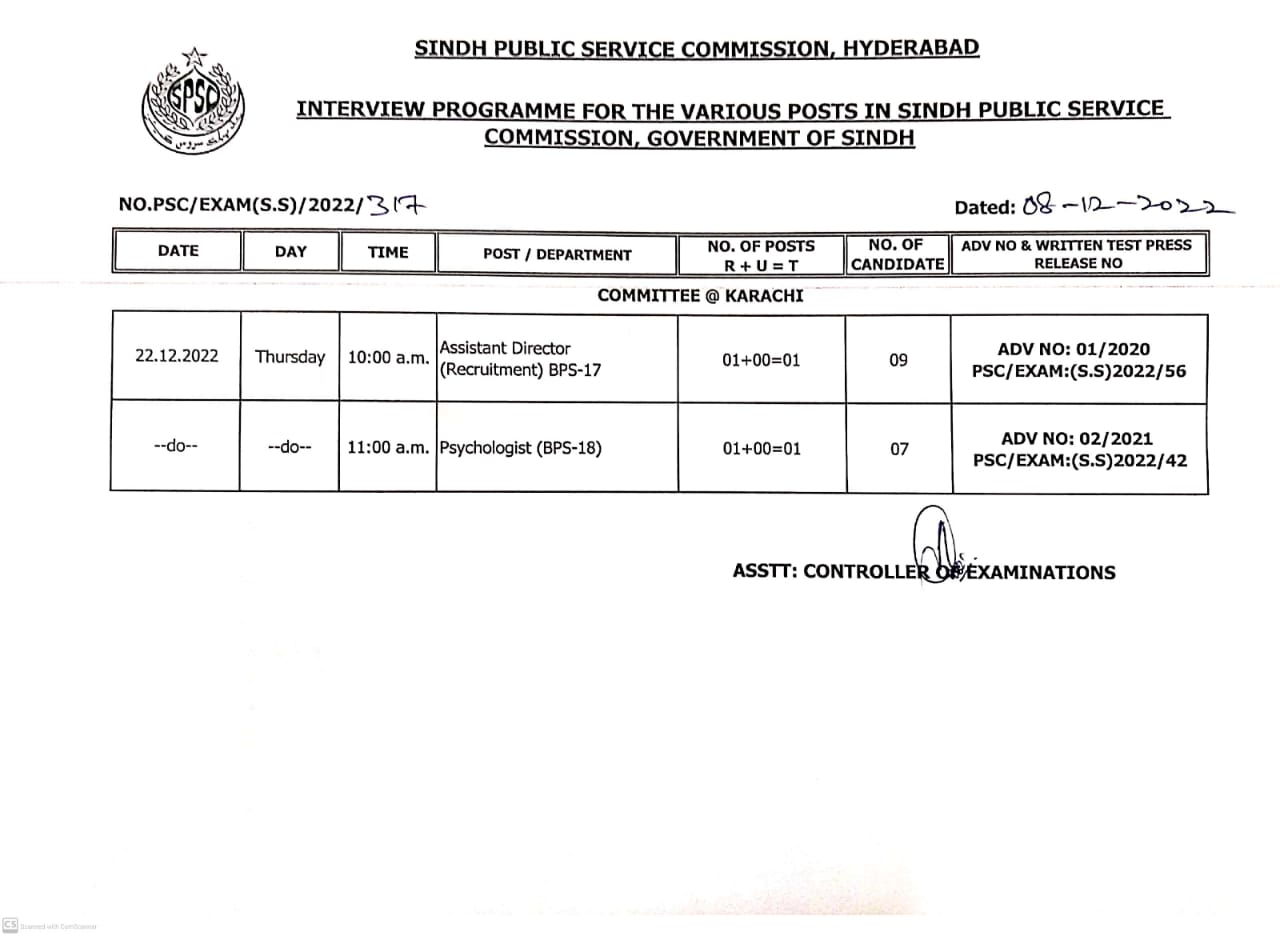 Hyderabad, Sindh Public Service Commission SPSC has announced the interview schedule 2022 for the month of Assistant Director and Psychologist. Candidates can download SPSC Interview Schedule 2022 from here.