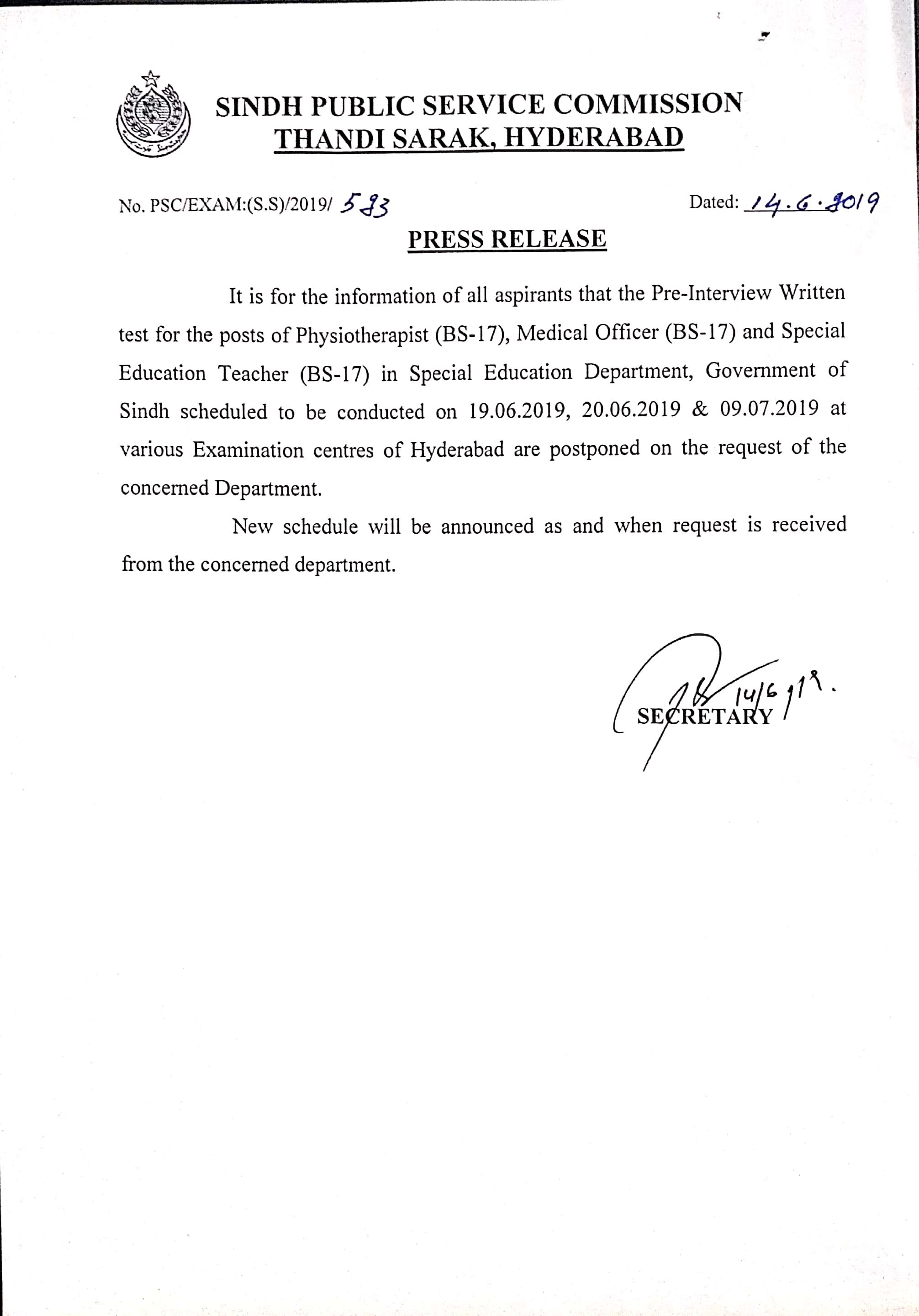 Sindh Public Service Commission SPSC has been updated written test schedule for the post of Physiotherapist. now scheduled to be conducted on 19 20 June 2019 at various examination centers.