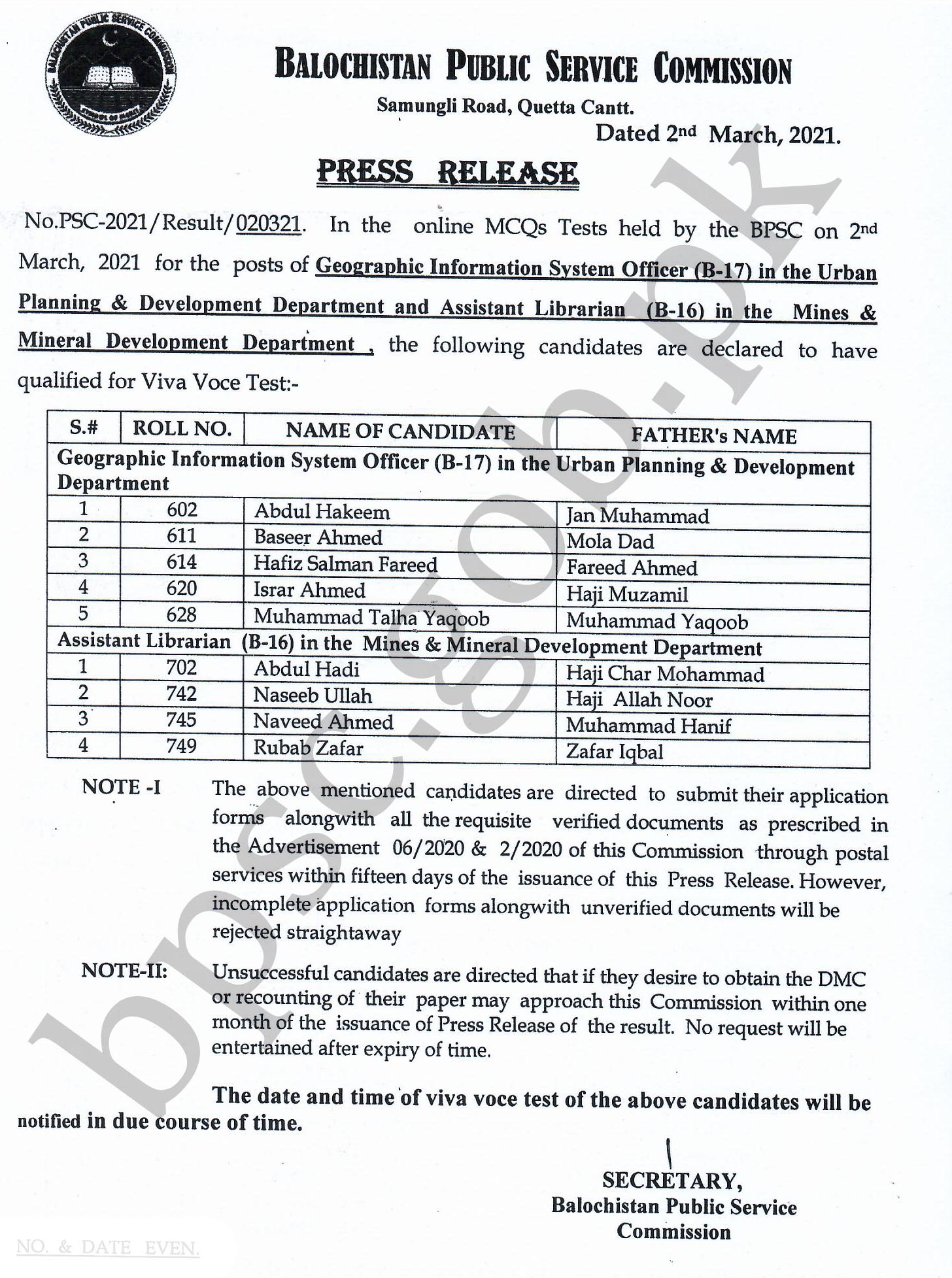 Balochistan Public Service Commission BPSC has announced screening test result against the position of Geographic Information System Officer in Urban Planning and Development Department, Assistant Librarian in Mines and Minerals Development Department, Govt of the Balochistan.