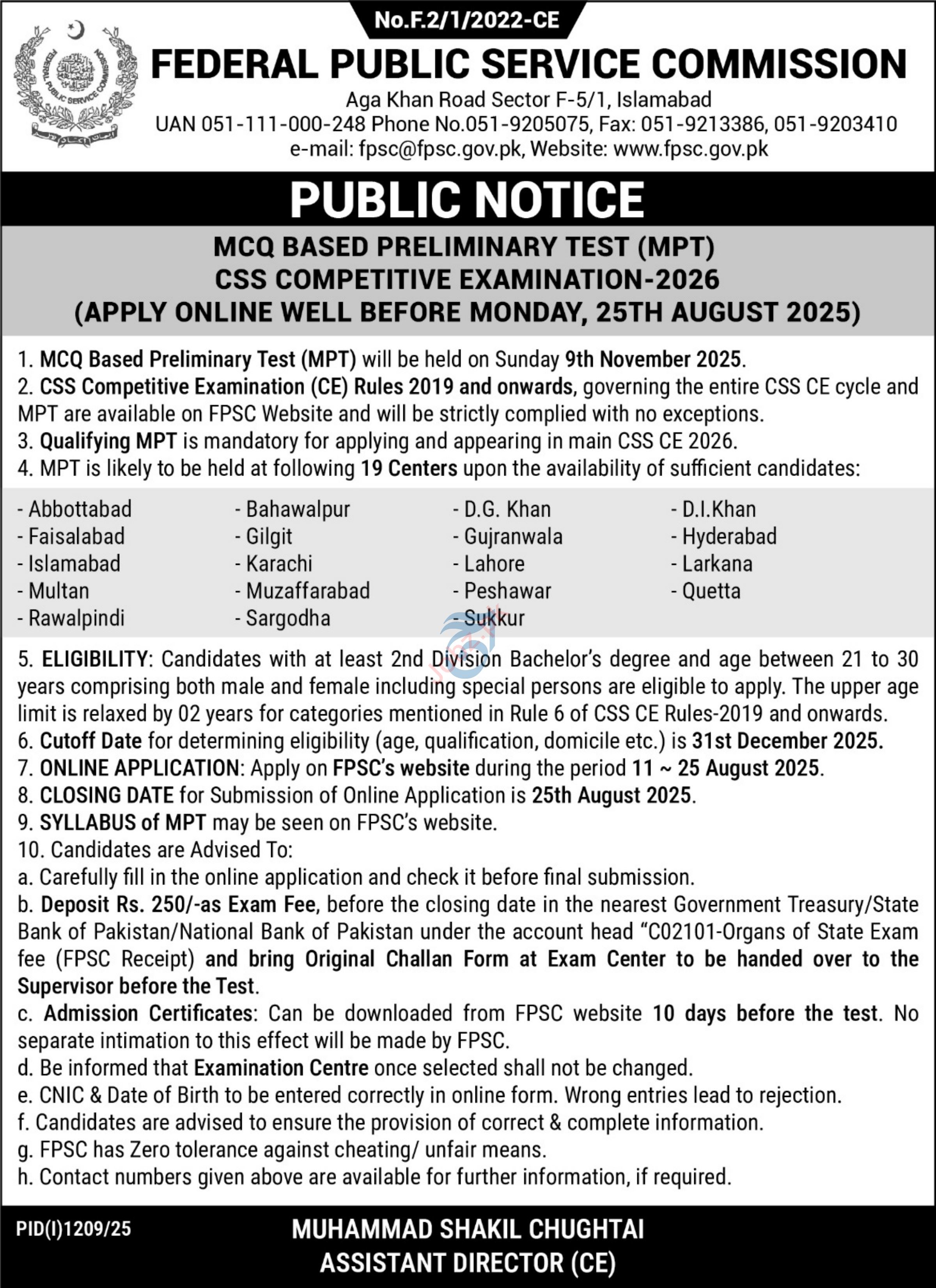 Federal Public Service Commission FPSC is looking for candidates for following posts as per job advertisement published in daily Aaj Newspaper of August 10, 2025 for location Islamabad, islamabad Islamabad Pakistan: