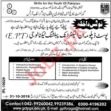 Technical Education & Vocational Training Authority TEVTA Government College of Technology Printing & Graphic Arts offers admission for Post Diploma In E.P.T Electronic Publishing Technology in Lahore. Read newspaper ad for exact details.