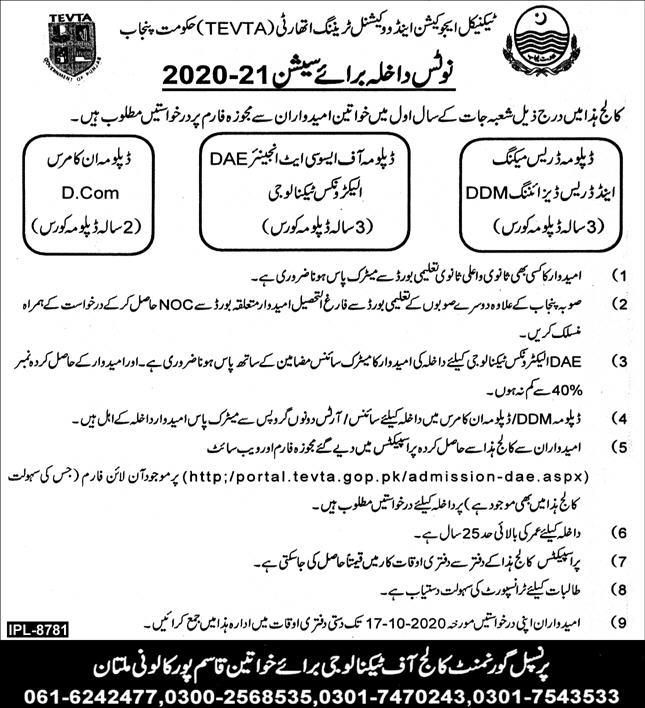 TEVTA Admissions For Diploma in Multan