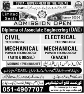 Technical Education & Vocational Training Authority TEVTA Government of The Punjab is offering admissions for Diploma of Associate Engineering DAE in Civil Technology, Electrical Technology & Mechanical Power Technology in Rawalpindi. Read newspaper ad for exact details.