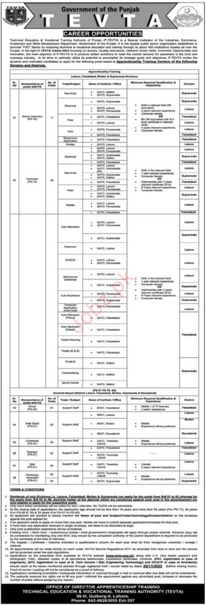 Vacant posts including naib qasid, sweeper, mali, chowkidar, instructor ii and instructor are announced in Technical Education and Vocational Training Authority TEVTA Lahore, lahore Punjab Pakistan as per 30 October 2022 advertisement in daily Nation Newspaper. Master, Mphil, Bachelor and Phd etc. educational qualification will be preferred.