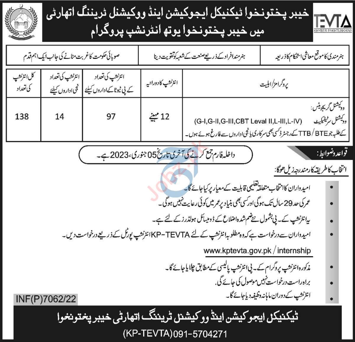 Technical Education and Vocational Training Authority TEVTA Peshawar, peshawar Khyber Pakhtunkhwa KPK Pakistan invites applications from eligible candidates for the post of internship program as per advertisement of December 18, 2022 published in daily Aaj Newspaper. Educational qualifications required Bachelor and Master etc.