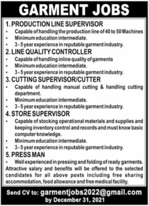 A leading Garment and Textile Industry in Karachi is urgently looking for experienced, qualified, hardworking and motivated persons for the vacant positions of Production Line Supervisor, Line Quality Controller, Cutting Supervisor, Cutter, Store Supervisor, Press Man.