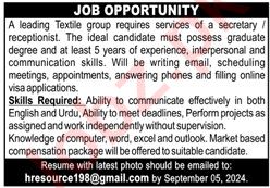 Textile Group jobs advertisement dated about 1 September 2024 in daily Jang Newspaper invites application for the vacant post of receptionist and secretary in Lahore, lahore Punjab Pakistan. Intermediate and Bachelor etc. educational qualification will be preferred.