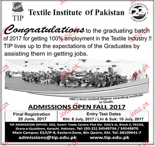 Textile Institute of Pakistan Admission in BS and BBA in Karachi. Read newspaper ad for exact details.