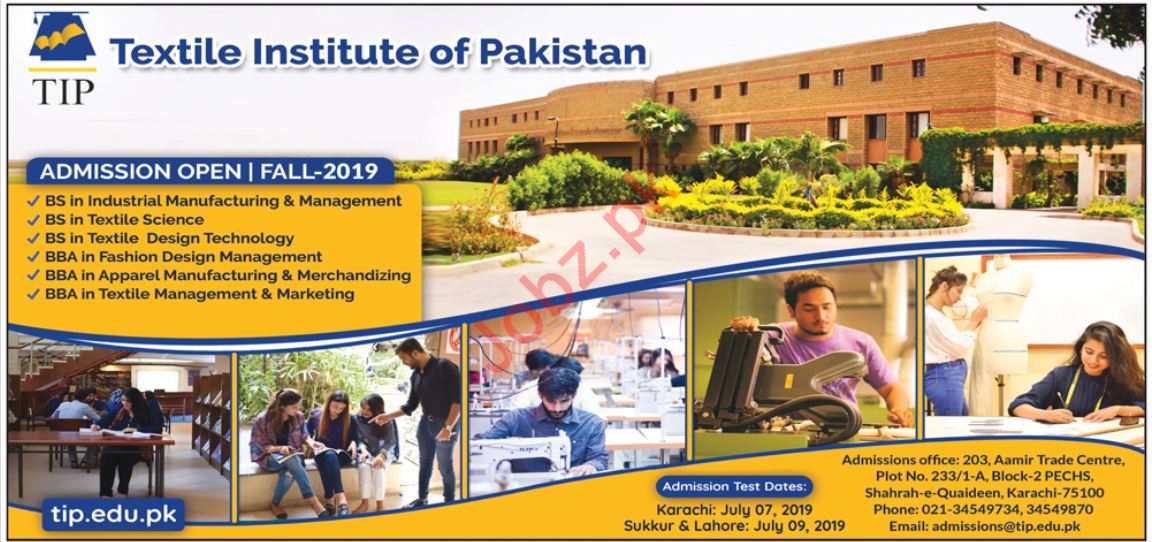 Textile Institute of Pakistan TIP has Announced admissions in BS Industrial Manufacturing & Management, BS Textile Sciences, BS Textile Design Technology, BBA Fashion Design Management in Karachi, Sukkur and Lahore Read newspaper ad for exact details.