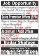 Badar Shafoon Fabric Manufacture Lahore, lahore Punjab Pakistan invites applications from eligible candidates for the post of sales promotion officer, accountant and audit officer as per advertisement of June 2, 2024 published in daily Jang Newspaper. Candidates with M.com, Bachelor and B.com etc. educational background will be preferred.
