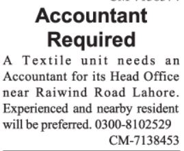 Textile Unit invites applications for job positions advertised in daily Jang dated 7 October 2023 for following vacancies in Lahore, lahore Punjab Pakistan.