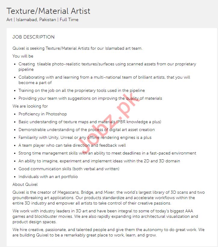 Texture Artist & Material Artist Jobs 2019 in Islamabad
