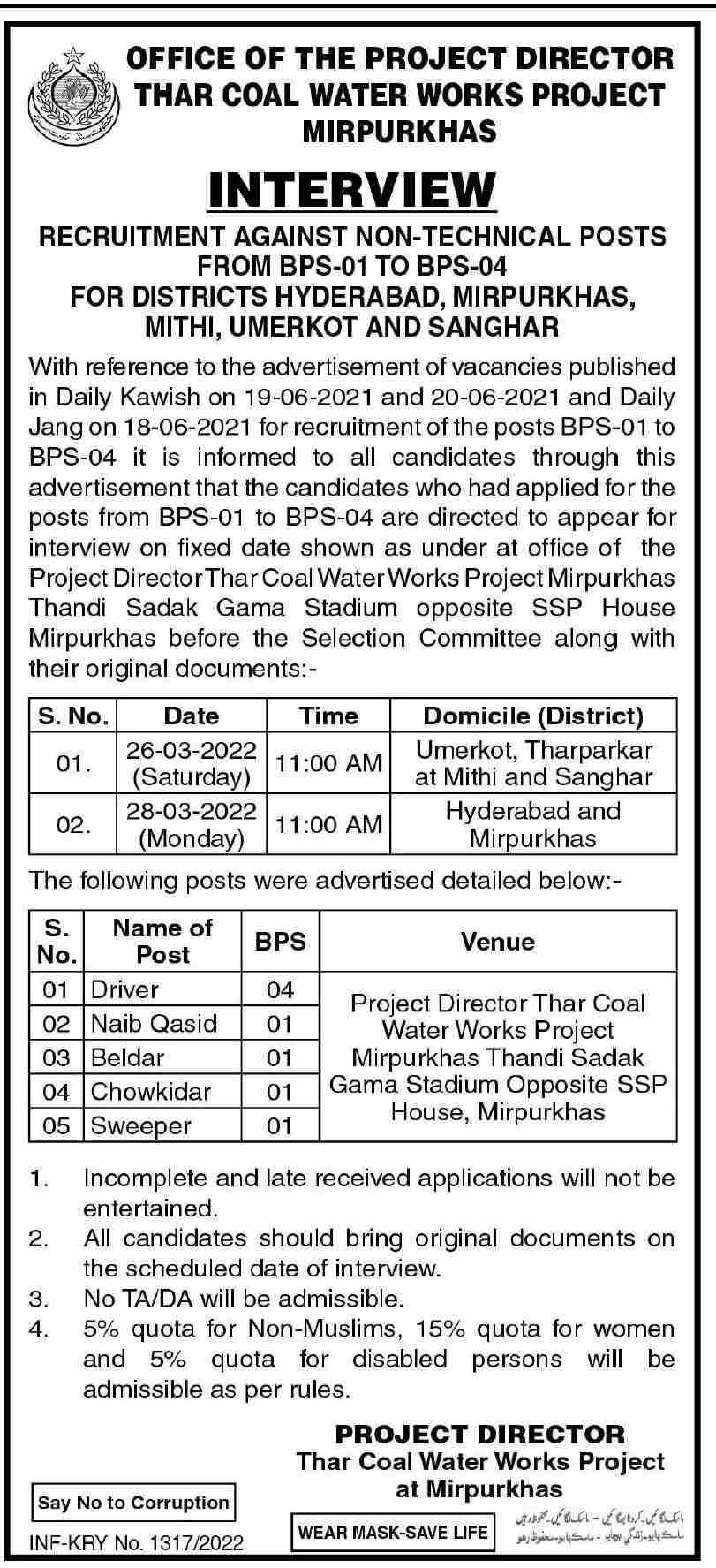 Vacant posts including chowkidar, sweeper, driver, naib qasid and beldar are announced in Thar Coal Water Works Mirpur Khas, mirpur khas Sindh Pakistan as per 13 March 2022 advertisement in daily Dawn Newspaper. Educational qualifications required Primary and Middle etc.