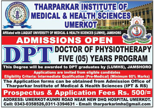 Tharparkar Institute of Medical & Health Sciences Umerkot affiliated with Liaquat University of Medical & Health Sciences LUMHS Jamshoro invited application for admissions in Doctor of Physiotherapy DPT 5 Year Program 2021. Read newspaper ad for exact details.