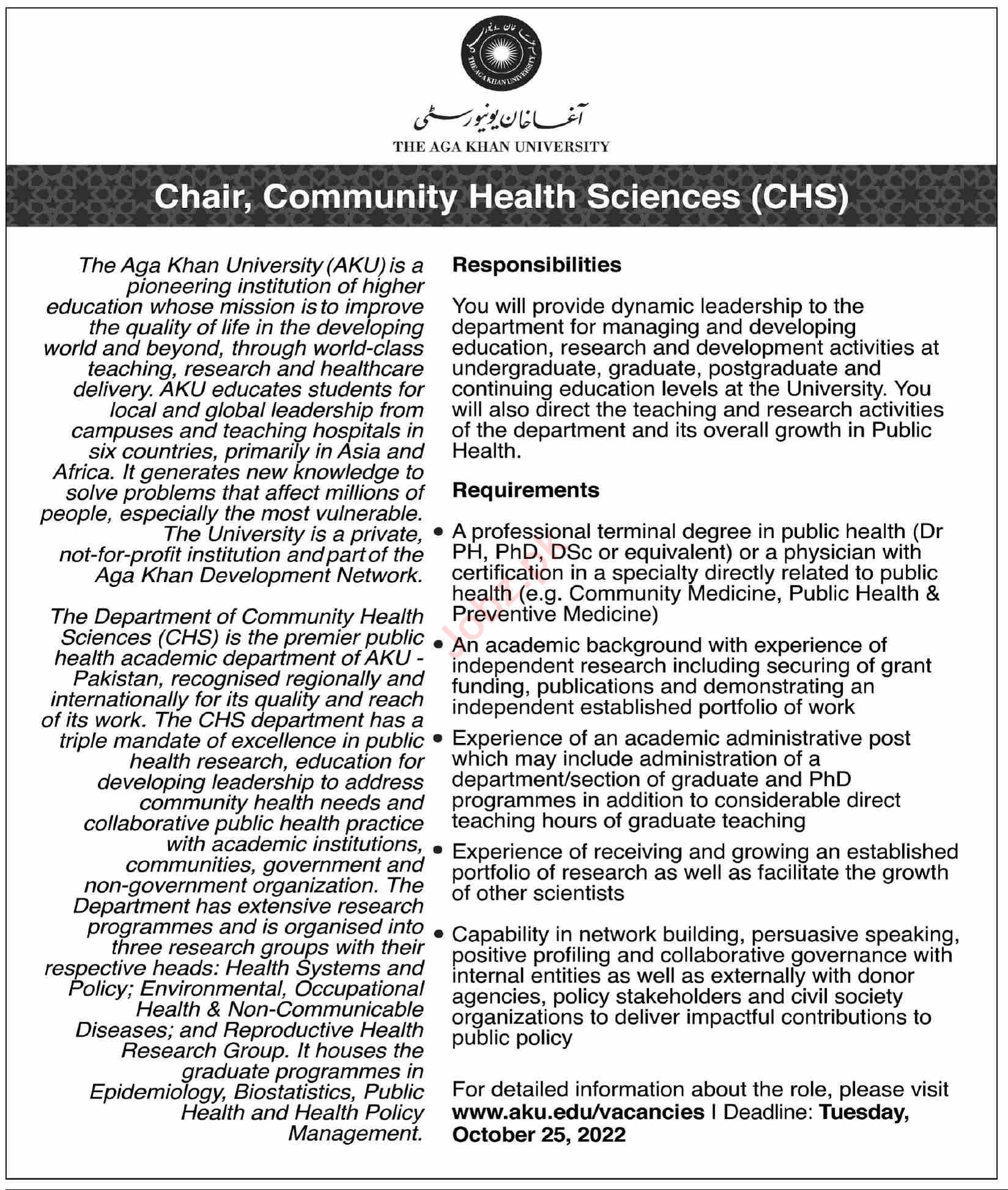 The Aga Khan University invites applications for job positions advertised in daily Dawn dated 26 September 2022 for following vacancies in Karachi, karachi Sindh Pakistan.
