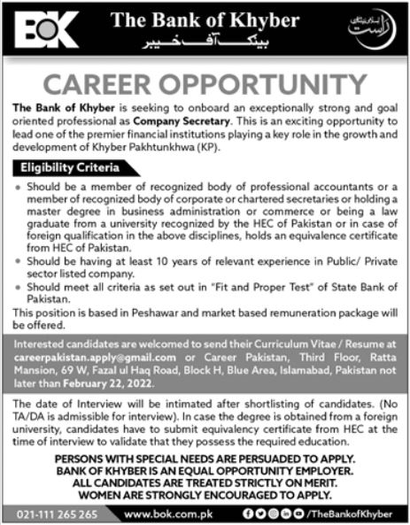 The Bank Of Khyber BoK Company Secretary Jobs 2022