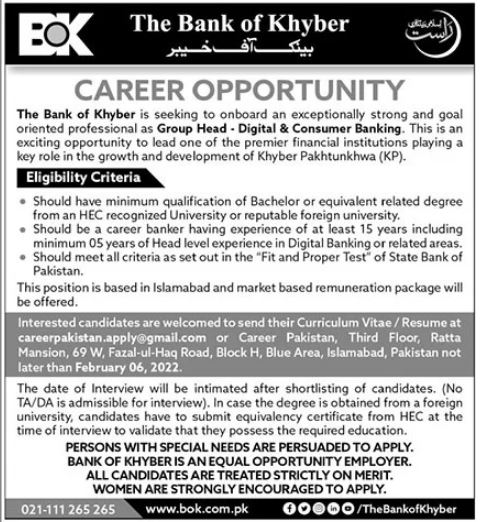 The Bank of Khyber Peshawar, Islamabad Khyber Pakhtunkhwa KPK Pakistan invites applications from eligible candidates for the post of Group Head Digital Consumer Banking as per advertisement of January 30, 2022 published in daily The News Newspaper. Persons with Master and Bachelor etc. education can apply.