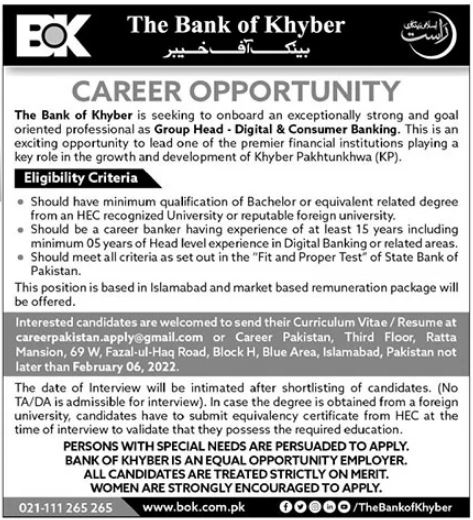 The Bank of Khyber jobs advertisement dated about 30 January 2022 in daily The News Newspaper invites application for the vacant post of Group Head in Peshawar Khyber Pakhtunkhwa KPK Pakistan. Preferred Education is BBA, MBA and ACCA etc.