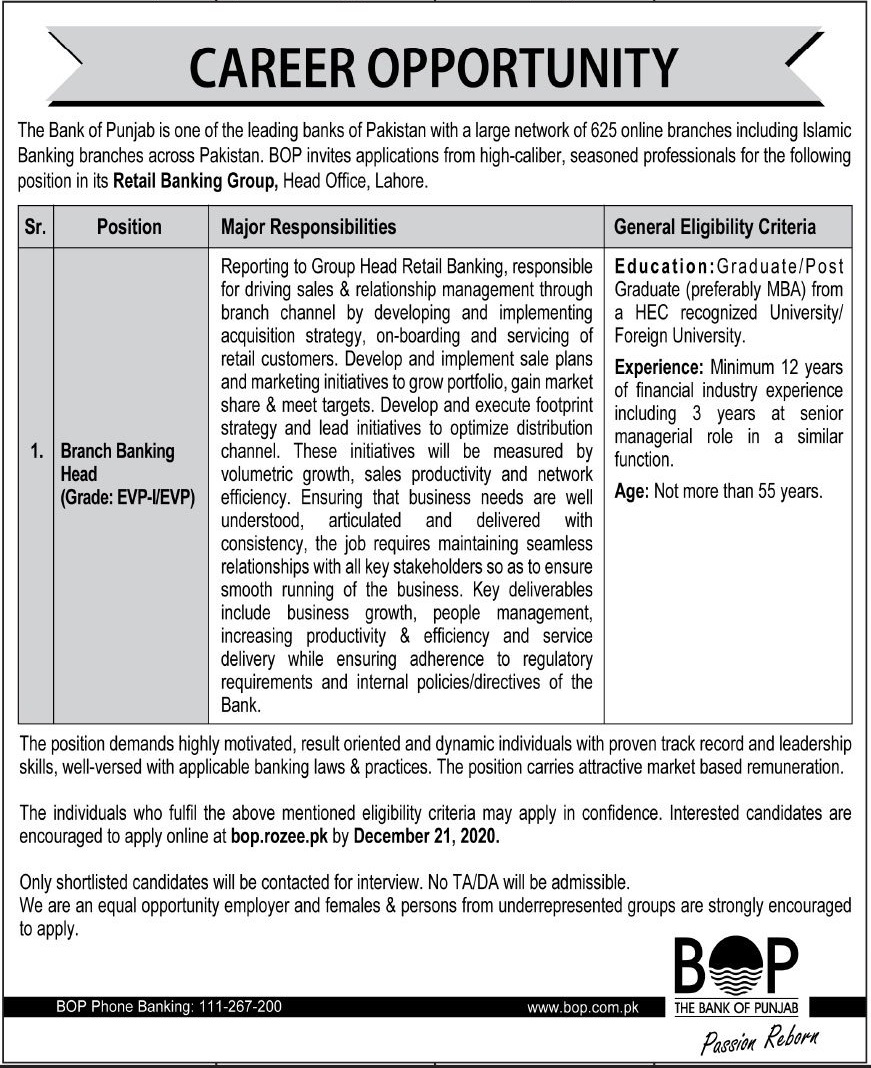 Vacancies in The Bank of Punjab BOP Advertisement December 2020