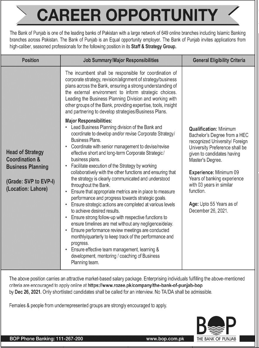 Vacancies in The Bank of Punjab BOP Advertisement December 2021