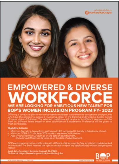 The Bank of Punjab BOP jobs advertisement dated about 13 August 2023 in daily Jang Newspaper invites application for the vacant post of women inclusion program in Lahore, lahore Punjab Pakistan. Preferred Education is Bachelor etc.