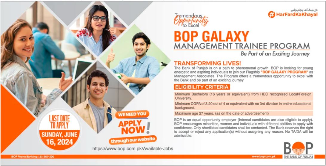 The Bank of Punjab BOP Lahore, lahore Punjab Pakistan invites applications from eligible candidates for the post of bop galaxy management trainee program as per advertisement of June 2, 2024 published in daily Jang Newspaper. Persons with Bachelor etc. education can apply.
