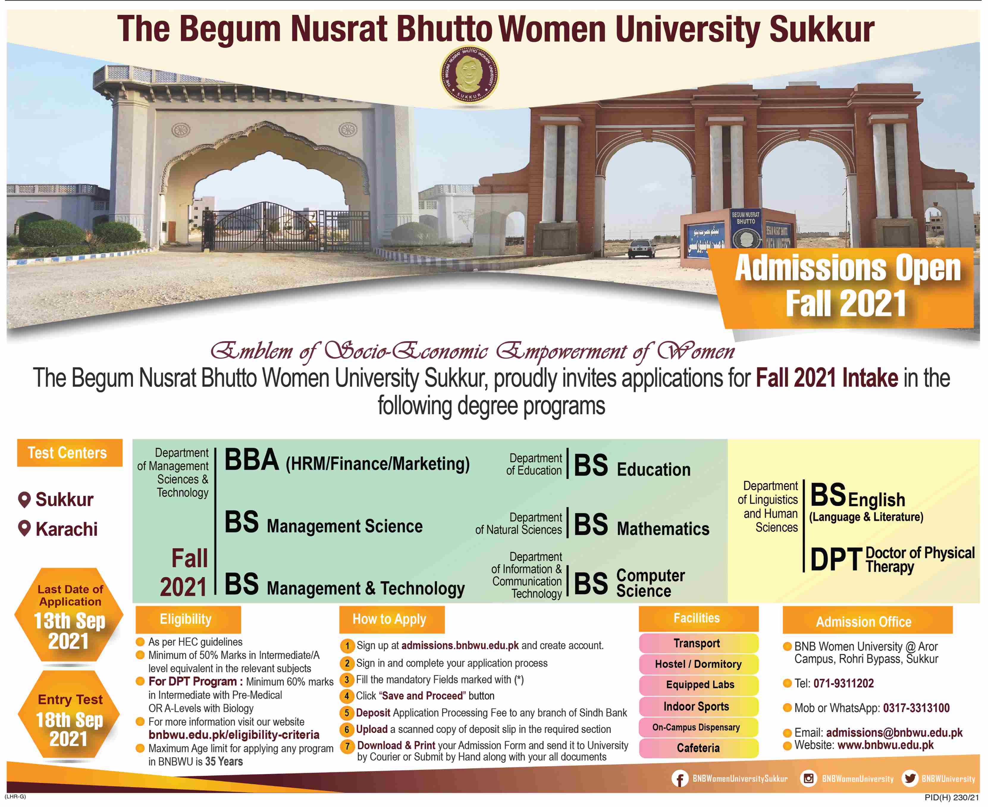 The Begum Nusrat Bhutto Women University Sukkur proudly invites applications for admissions in BBA, BS Management Science, BS Management & Technology, BS Education, BS Mathematics, BS Computer Science, BS English and DPT degree programs 2021. Read newspaper ad for exact details.