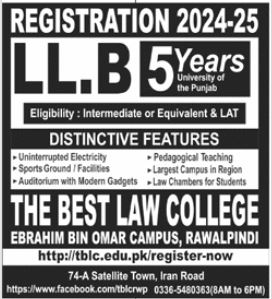 Admissions in The Best Law College 2024 for LLB 5 Years Program has been announced. Eligible students can apply for academic admissions 2024 in The Best Law College Rawalpindi Punjab Pakistan for Law College. Eligible students for fulfilling criteria for admissions in LLb can enroll as per Private admission policy 2024 till closing date 23 September 2024. Read newspaper ad for exact details.