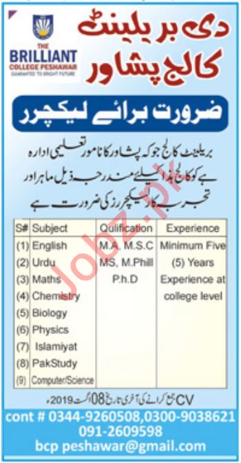 The Brilliant College invites applications from highly qualified and well educated candidates for the positions of English Lecturer, Urdu Lecturer, Math Lecturer, Chemistry Lecturer, Biology Lecturer, Physics Lecturer, Islamiyat Lecturer, Pak Study Lecturer, Computer Science Lecturer in Peshawar KPK 2019.