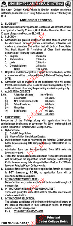 The Cadet College Kohlu Admission in Class VII 3rd Entry in Kohlur. The Candidate must have passed at least Class VI Examination from a recognized school by 1st March 2018. Read newspaper ad for exact details.
